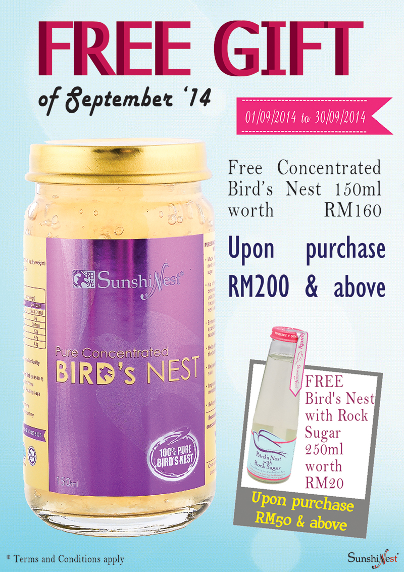 SunshineNest free gift for the month of September 2014 is Concentrated Bird’s Nest (150ml) and Bird’s Nest with Rock Sugar (250ml).