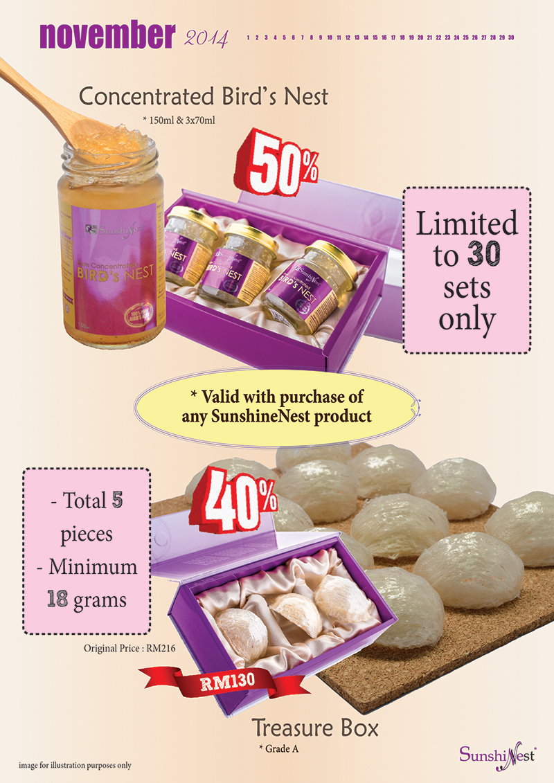 Grab the half-price promotion for Concentrated Bird’s Nest from 1st November to 30th November; you can share with family and friends because it’s limited to 30 sets only.